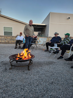 And we have the occasional campfire and have developed a real system. Gerry is the official fire starter as he has a special lighter and he starts it for afternoon happy hour. We sit around the fire and as the fire dies down, we put our supper on the coals and when it's supper time the food is cooked, the coals are pretty well done and are no longer throwing much heat for warmth, we call it another great day.